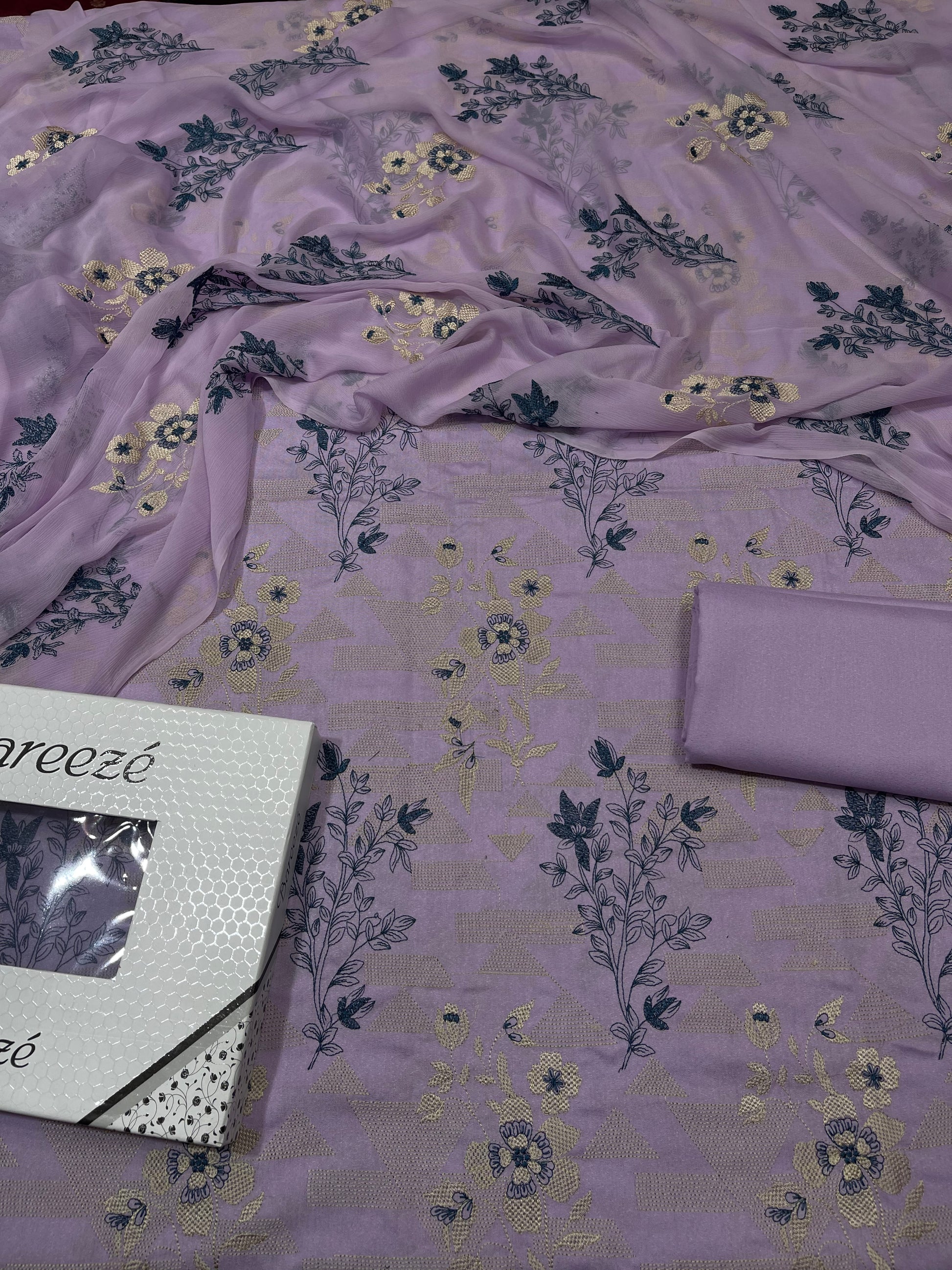 Bareeze- Karandi 3 Pcs All Over Embroidered Unstitched Suit With Chiffon Dupatta